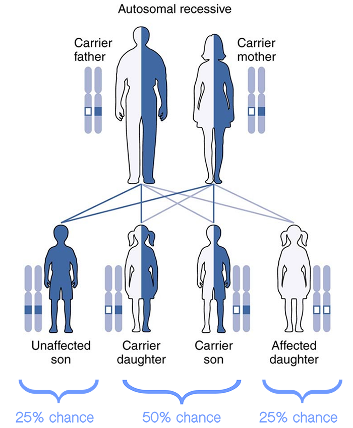 ADSSL1 Myopathy is an autosomal recessive disorder, which means that the parents of someone affected by ADSSL1 Myopathy are both carriers of the disease. Carriers are not affected by the disease, which means that they don’t show symptoms of the disease. But when two carriers have a child, there is a 25% chance with each pregnancy of having a child who has ADSSL1 Myopathy, a 50% chance that each child will be a carrier like his or her parents (and not have the disease), and a 25% chance that each child will not carry any mutation for the disease (meaning that he or she will not be a carrier nor will he or she have the disease). Please refer to the figure below.